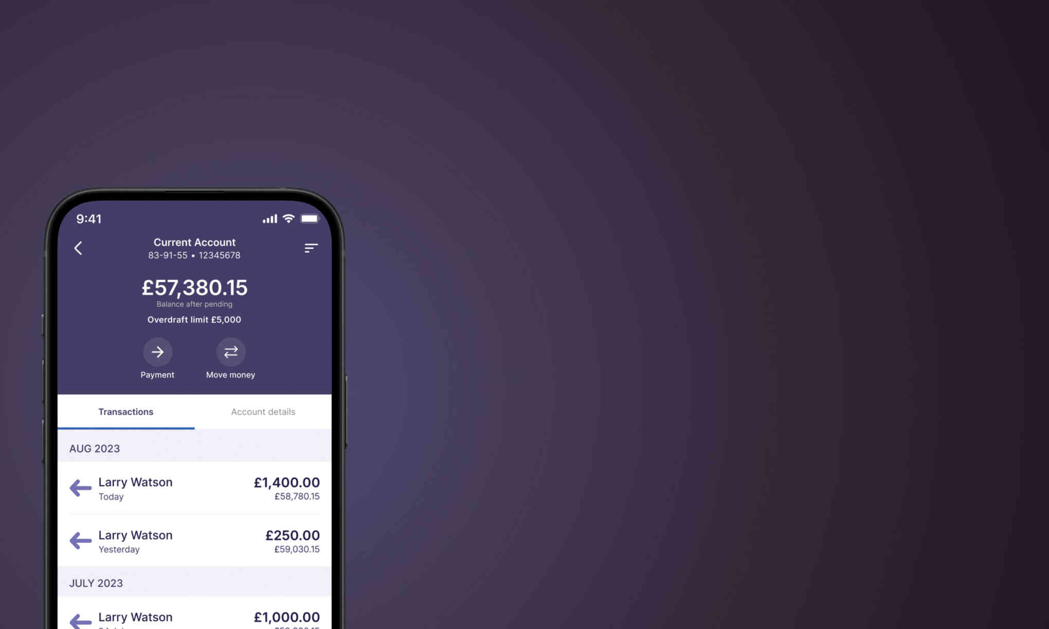 Select the account you would like more information on and choose ‘Account details’ from the top menu. Here you will find details of your account number, sort code, SWIFT / BIC and IBAN.